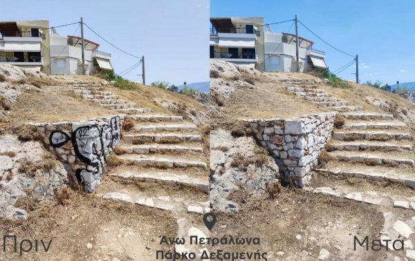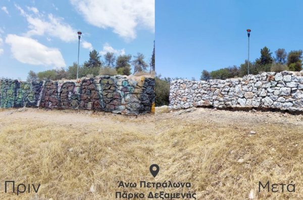 Αντίστοιχης κλίμακας επιχείρηση πραγματοποιήθηκε τις προηγούμενες μέρες στο πάρκο Δεξαμενής, στη γειτονιά των Άνω Πετραλώνων. Οι τοίχοι από πέτρα και μάρμαρο, περιμετρικά του πάρκου, παρέμεναν επί πολλά χρόνια βανδαλισμένοι από χρώματα σε σπρέι, ειδικούς μαρκαδόρους και μπογιές. Σε συνδυασμό με τον ήλιο και τις υψηλές θερμοκρασίες που είχαν επιδράσει στα χρώματα, η επιχείρηση της αφαίρεσής τους ήταν ιδιαίτερα δύσκολη, ωστόσο ολοκληρώθηκε αποτελεσματικά. Για τον καθαρισμό συνολικά 240 τ.μ. επιφάνειας χρησιμοποιήθηκαν 173 λίτρα ειδικού διαλυτικού υγρού και χρειάστηκε να εργαστούν, επί 7 ημέρες, οκτώ εργαζόμενοι του τομέα καθαριότητας.