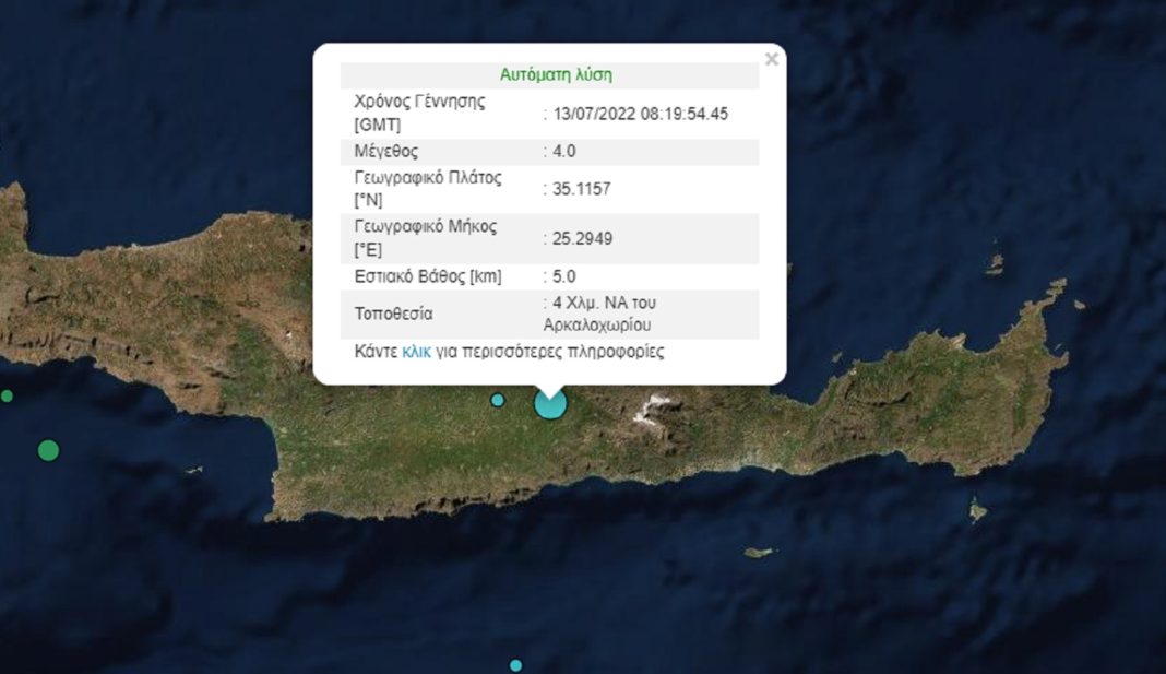 Σεισμική δόνηση 4 βαθμών της κλίμακας ρίχτερ σημειώθηκε στις 11.19 σήμερα το πρωί με επίκεντρο για μια ακόμη φορά τη γνωστή περιοχή του Αρκαλοχωρίου,