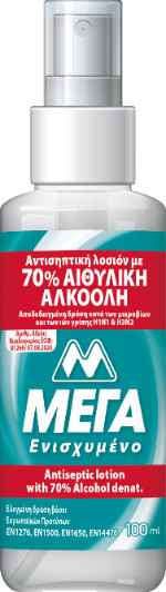Με 70% οινόπνευμα και επιπλέον αντιβακτηριδιακό παράγοντα, η αντιβακτηριδιακή λοσιόν ΜΕΓΑ, χάρη στην πρακτική συσκευασία 100ml με σπρέι, χωράει σε όλες τις τσάντες, ενώ μπορείτε να την έχετε μαζί σας ακόμα και αν ταξιδεύετε με αεροπλάνο. Επιπλέον, εφαρμόζεται εύκολα και δεν κολλάει, ενώ προστατεύει αποτελεσματικά τα χέρια σας εξουδετερώνοντας έως και το 99,9% των μικροβίων, αλλά και τους ιούς της γρίπης Η1Ν1 και Η3Ν2.