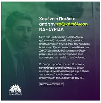 Ο κ. Ανδρουλάκης τόνισε ότι, μετά από μια δεκαετία αλλεπάλληλων κρίσεων, τα ζητήματα παιδείας, αντί να αποτελούν κοινή αγωνία όλων των πολιτικών δυνάμεων, «αξιοποιούνται από τη ΝΔ και τον ΣΥΡΙΖΑ για να αυξηθεί τεχνητά η πόλωση μεταξύ τους, με μόνους χαμένους τους φοιτητές και την παιδεία στο σύνολό της».
