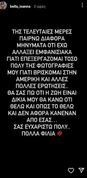 «Τις τελευταίες μέρες παίρνω πολλά μηνύματα ότι έχω αλλάξει εμφανισιακά και γιατί επεξεργάζομαι τόσο πολύ τις φωτογραφίες, γιατί βρίσκομαι στην Αμερική και άλλες πολλές ερωτήσεις…Θα σας πω ότι η ζωή είναι δικιά μου, θα κάνω ό,τι θέλω και όπως το θέλω και δεν αφορά κανέναν από εσάς. Σας ευχαριστώ πολύ. Πολλά φιλιά».