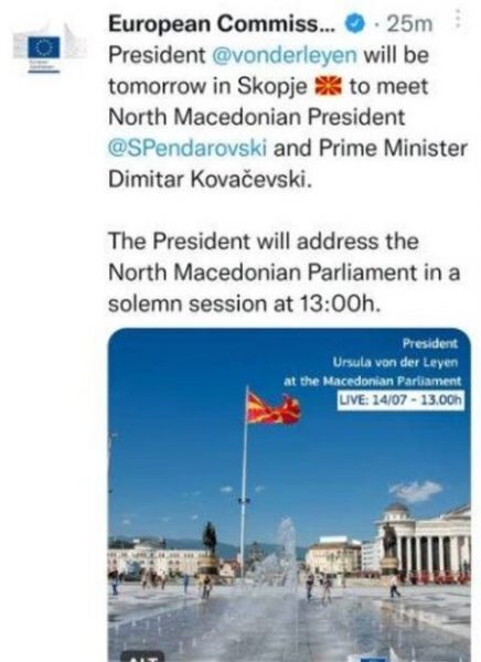 «Η πρόεδρος φον ντερ Λάιεν θα βρίσκεται αύριο στα Σκόπια για να συναντηθεί με τον Βορειομακεδόνα Πρόεδρο Στέβο Πενταρόφσκι και τον πρωθυπουργό Ντίμιταρ Κοβάτσεφσκι. Η πρόεδρος θα μιλήσει στο Βορειομακεδονικό Κοινοβούλιο στη σύνοδο της ολομέλειας στις 13:00h», έγραφε το πρώτο tweet.