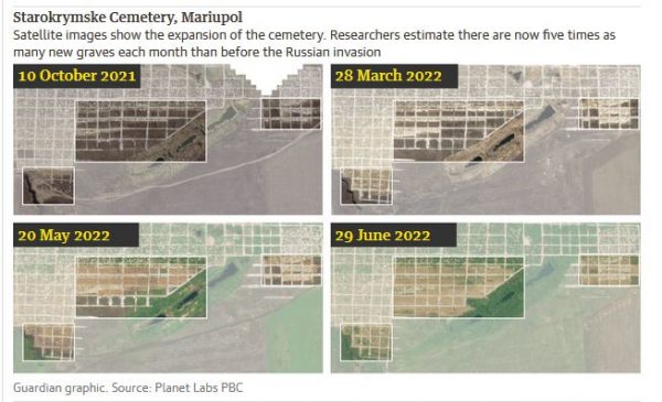 Στο νεκροταφείο Σταροκρίμσκε της Μαριούπολης (νοτιοανατολικά) για παράδειγμα, οι συντάκτες της έρευνας υπολογίζουν πως σε περίοδο πέντε μηνών σκάφτηκαν 1.000 νέα μνήματα, από την 21η Οκτωβρίου 2021 ως την 28η Μαρτίου 2022 — έναν μήνα μετά την έναρξη του πολέμου.
