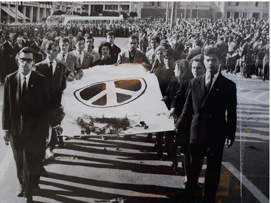 Φοιτητές και φοιτήτριες του ΕΚΠΑ, μέλη του Φοιτητικού Φιλειρηνικού συλλόγου «Μπέρτραντ Ρασέλ» συνοδεύουν την σωρό του Λαμπράκη με την ελληνική σημαία και τον αντεστραμμένο πύραυλο, σήμα του Αφοπλισμού και της Ειρήνης. Πρώτος δεξιά, ο επικεφαλής του συλλόγου και συμφοιτητής μου στη Νομική του ΕΚΠΑ Μιχάλης Περιστεράκης.