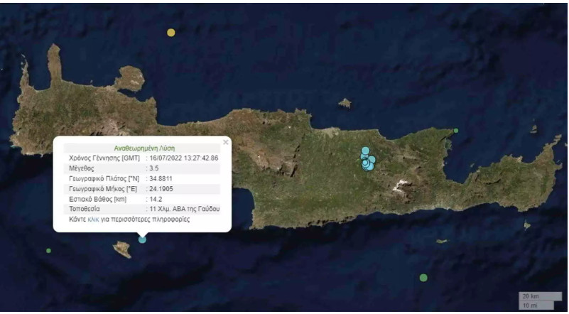 Ο σεισμός στη Γαύδο έγινε στις 15:27 το μεσημέρι του Σαββάτου και έχει μέγεθος 3,5 βαθμούς της κλίμακας Ρίχτερ.
