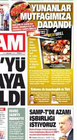 Κεντρικό θέμα της εφημερίδας, σύμφωνα με τον ΣΚΑΪ, είναι εάν το κοκορέτσι και το ιμάμ μπαϊλντί είναι τουρκικά ή ελληνικά πιάτα.