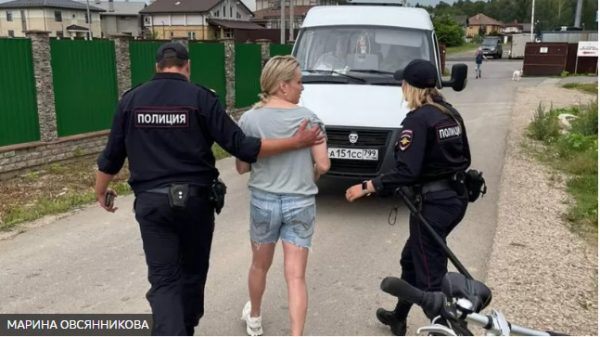 Η δημοσιογράφος Μαρίνα Οβσιανίκοβα, πρώην υπάλληλος του ρωσικού Πρώτου Καναλιού, συνελήφθη, επιβεβαίωσε ο δικηγόρος της στο BBC, και μετά τρεις ώρες αφέθηκε ελεύθερη αφού της ασκήθηκε ποινική δίωξη.