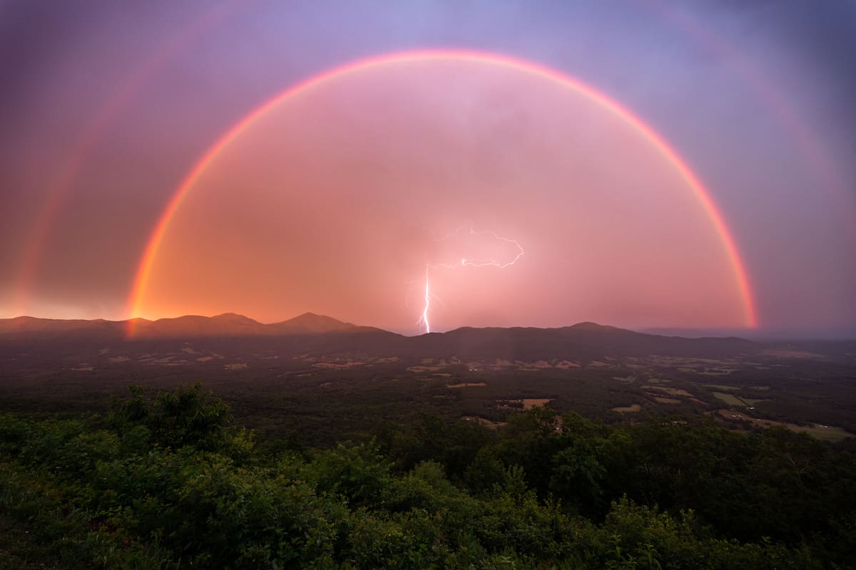 Το αποτέλεσμα είναι μια ονειρική εικόνα όπου τα ουράνια τόξα μοιάζουν με καμπαναριά που παγιδεύουν τον κεραυνό. Ο ροζ και μοβ ουρανός απλώς ενισχύει τη μαγική αίσθηση της φωτογραφίας, η οποία προέκυψε επειδή ο Rinehart ήξερε πώς να μελετήσει τις προβλέψεις του καιρού.