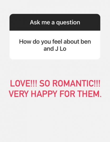 Η ηθοποιός σε ερώτηση θαυμαστή της στο Instagram, σχετικά με το πώς νιώθει για τον γάμο του ζευγαριού απάντησε: «Νιώθω αγάπη. Είναι τόσο ρομαντικό και είμαι τόσο χαρούμενη για αυτούς».