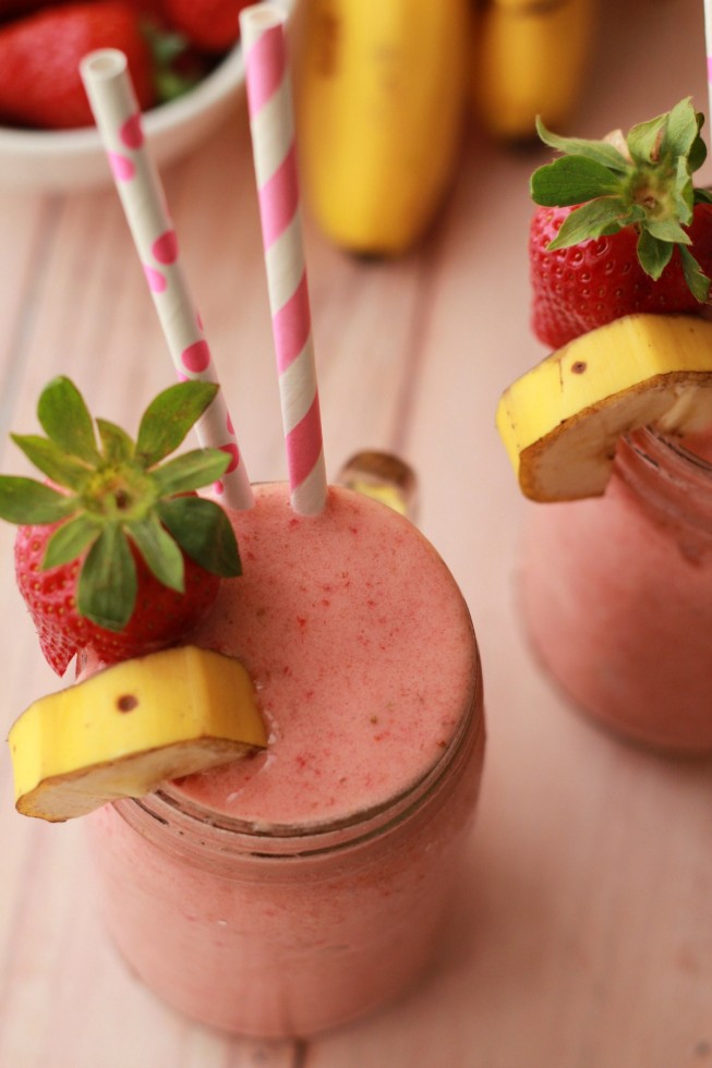 Κόβουμε τη μπανάνα σε ροδέλες και τη βάζουμε στο μπλέντερ μαζί με τις φράουλες, το γιαούρτι, το γάλα και το μέλι. Το χτυπάμε καλά μέχρι να γίνουν ένα ωραίο παχύρευστο μείγμα, χωρίς κομματάκια. Μοιράζουμε το μείγμα σε δυο μεγάλα ποτήρια και το σερβίρουμε λίγο δροσερό.