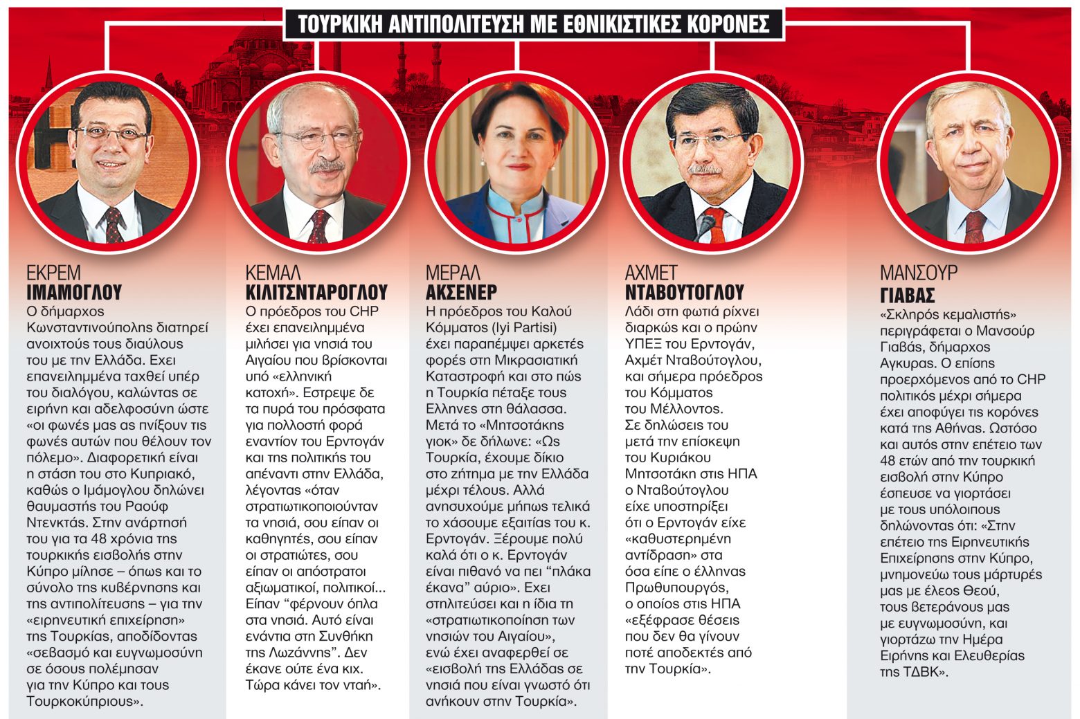 Και αν ο δήμαρχος Κωνσταντινούπολης, Εκρέμ Ιμάμογλου, εμφανίζεται να έχει την πλέον διαλλακτική ρητορική, ο αρχηγός του CHP, του κόμματος στο οποίο ανήκει, ο Κεμάλ Κιλιτσντάρογλου έχει επανειλημμένα κατηγορήσει τον τούρκο πρόεδρο για υποχωρήσεις στα ελληνοτουρκικά, ακόμα και για «δειλία», η οποία συνοδεύεται από απειλές κενές περιεχομένου.