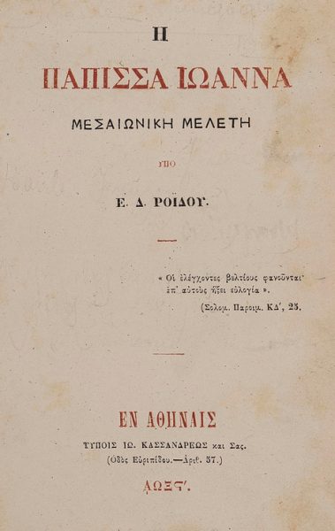 Και ενώ η Εκκλησία δεν επιμένει σε καταδίκη που η μεσαιωνίζουσα νοοτροπία του καιρού του είχεν επιβάλει στο συγγραφέα της «Πάπισσας Ιωάννας», έρχονται και τον λιθοβολούν ακριβώς εκείνοι που θέσει έπρεπε να είναι υμνητές και υπερασπιστές του.