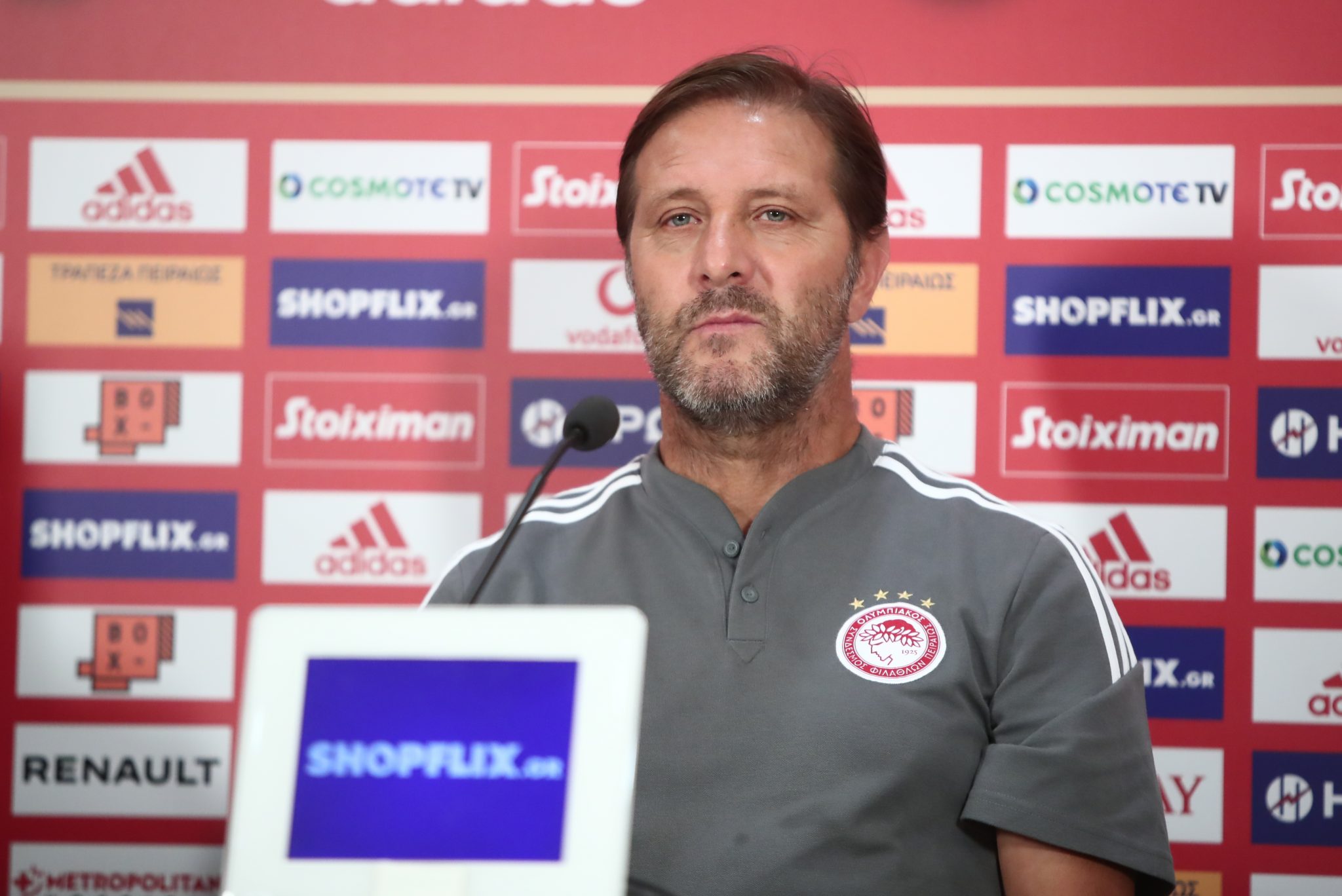 Για το αν μπορεί ο ίδιος να το γυρίσει: «Νιώθω ικανός και δυνατός. Δεν θα σταματήσω να πιστεύω στην ομάδα και στους παίκτες. Ξέρω ότι περνάμε δύσκολες στιγμές, έχουμε περάσει κι άλλες. Πάντα πιστεύω στον εαυτό μου ότι μπορώ να δουλέψω και να ξεπεράσουμε τα προβλήματα. Υπάρχει η δύναμη γιατί δεν θα σταματήσω να πιστεύω στην ομάδα. Πιστεύω στον εαυτό μου. Είμαι σίγουρος ότι θα ξεπεράσουμε τα προβλήματος. Αν εσείς λέτε ότι είμαι μέρος του προβλήματος εγώ λέω ότι είμαι μέρος της λύσης. Βλέπω ότι επιμένετε να μιλάτε για την περασμένη χρονιά. Την περασμένη χρονιά πήραμε το πρωτάθλημα με πολλούς βαθμούς διαφορά. Δεν έχει σημασία να μιλάμε για την περσινή χρονιά. Πρέπει να κοιτάξουμε τι συνέβη σήμερα και να λύσουμε τα προβλήματα. Εγώ είμαι εδώ για να κοιτάξω πως θα εκπληρώσουμε τους στόχους μας και είμαι σίγουρος ότι θα τα καταφέρουμε».