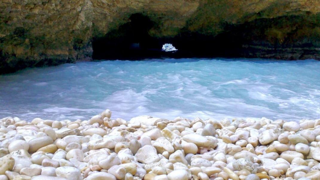 Ένας βράχος που αγκαλιάζει μια μικρή παραλία με λευκό βότσαλο και τη θάλασσα, δημιουργώντας μια μικρή φυσική «πισίνα», εντυπωσιάζει τον ταξιδιώτη.