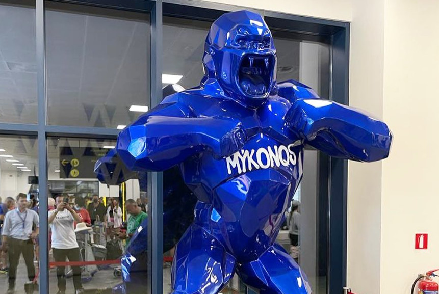 Ένας εντυπωσιακός μπλε γορίλας, που ξεπερνά τα δύο μέτρα σε ύψος, με την επιγραφή Mykonos, έχει τοποθετηθεί στο διεθνές αεροδρόμιο καλωσορίζοντας τους επισκέπτες, οι οποίοι στη θέα του μένουν έκπληκτοι.