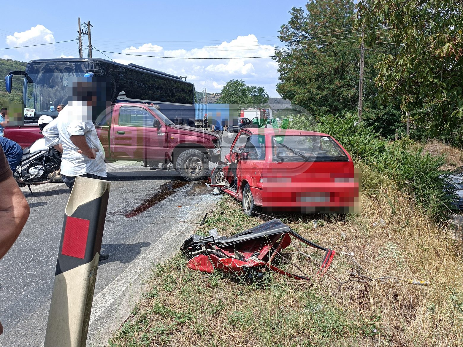 Ένα λεωφορείο με αλβανικές πινακίδες που ακολουθούσε κατάφερε να σταματήσει, ενώ ένα μπλε χρώματος ΙΧΕ όχημα που ακολουθούσε και στο οποίο επέβαινε ένα ζευγάρι, προσέκρουσε στο προπορευόμενο λεωφορείο.