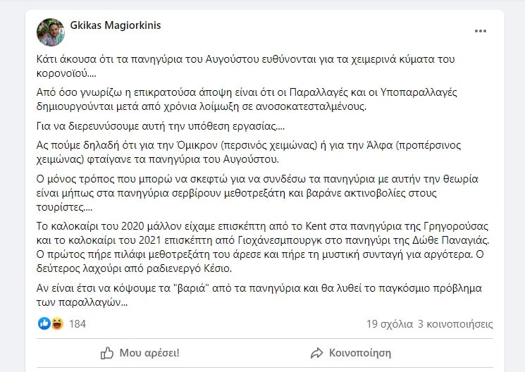 Ας πούμε δηλαδή ότι για την Όμικρον (περσινός χειμώνας) ή για την Άλφα (προπέρσινος χειμώνας) φταίγανε τα πανηγύρια του Αυγούστου.
