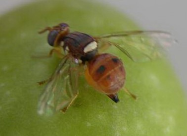 Ενήλικο θηλυκό άτομο του δάκου της ελιάς, με τον χαρακτηριστικό ωοθέτη στην άκρη της κοιλιάς. Με τον ωοθέτη το έντομο, τρυπά τον ελαιόκαρπο και αποθέτει εντός αυτού τα αυγά.