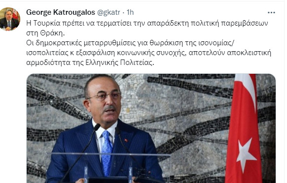Όπως αναφέρει σε ανάρτηση του με αιχμή την ανακοίνωση του υπουργείου Εξωτερικών της Τουρκίας, για το νέο νόμο για τις Μουφτείες, ο Γιώργος Κατρούγκαλος «η Τουρκία πρέπει να τερματίσει την απαράδεκτη πολιτική παρεμβάσεων στη Θράκη».