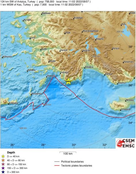 Σύμφωνα με το Ευρωμεσογειακό Ινστιτούτο, ο σεισμός σημειώθηκε 1 χιλιόμετρο από την τουρκική πόλη Κας, ενώ είχε εστιακό βάθος στα 15 χλμ.