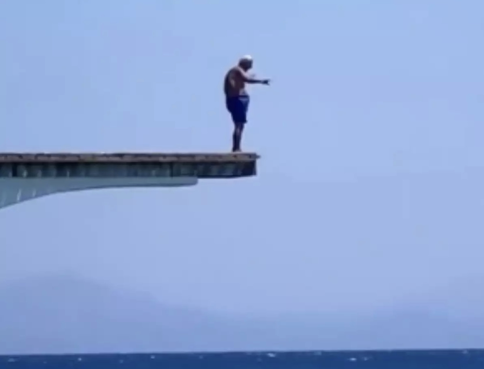 Όσοι βρίσκονταν στην παραλία παρακολουθούσαν με αγωνία τις κινήσεις του, καθώς ο υπερήλικας έφτανε στην άκρη του βατήρα.