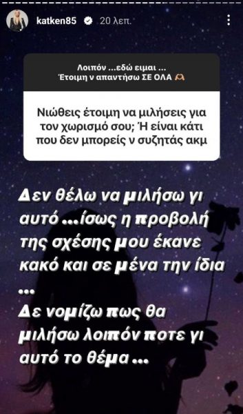 «Νιώθεις έτοιμη να μιλήσεις για τον χωρισμό σου; Ή είναι κάτι που δεν μπορείς να συζητάς ακόμα;» ήταν η ερώτηση follower, στην οποία η Κατερίνα Καινούργιου απάντησε: «Δε θέλω να μιλήσω για αυτό. Ίσως η προβολή της σχέσης μου έκανε κακό και σε μένα την ίδια.. Δε νομίζω πως θα μιλήσω λοιπόν ποτέ για αυτό το θέμα».