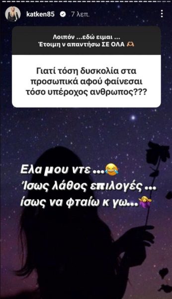Επίσης, στην ερώτηση: «Γιατί τόση δυσκολία στα προσωπικά, αφού φαίνεσαι τόσο υπέροχος άνθρωπος;», η παρουσιάστρια αποκρίθηκε: «Έλα μου ντε. Ίσως λάθος επιλογές… Ίσως να φταίω και εγώ».