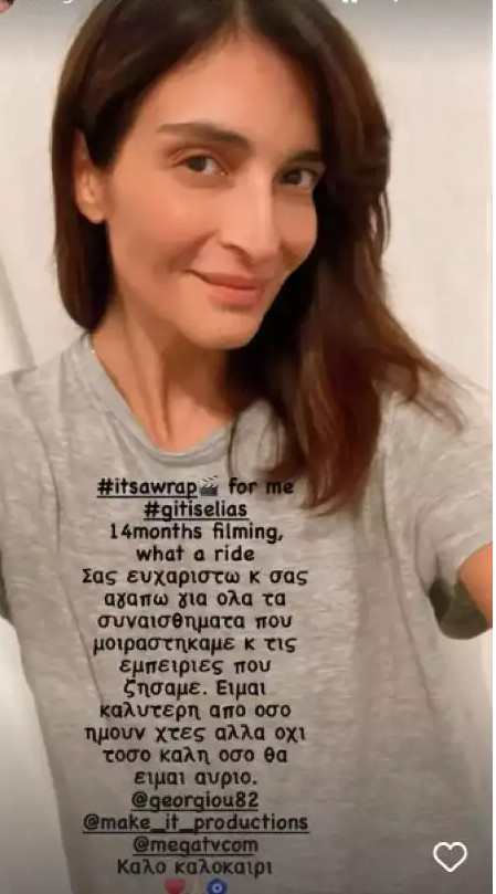 «14 μήνες γυρίσματα, τι διαδρομή, σας ευχαριστώ και σας αγαπώ για όλα τα συναισθήματα που μοιραστήκαμε και τις εμπειρίες που ζήσαμε. Είμαι καλύτερη από όσο ήμουν χτες, αλλά όχι τόσο καλή όσο θα είμαι αύριο» έγραψε στα instastories η Αντιγόνη Κουλουκάκου.