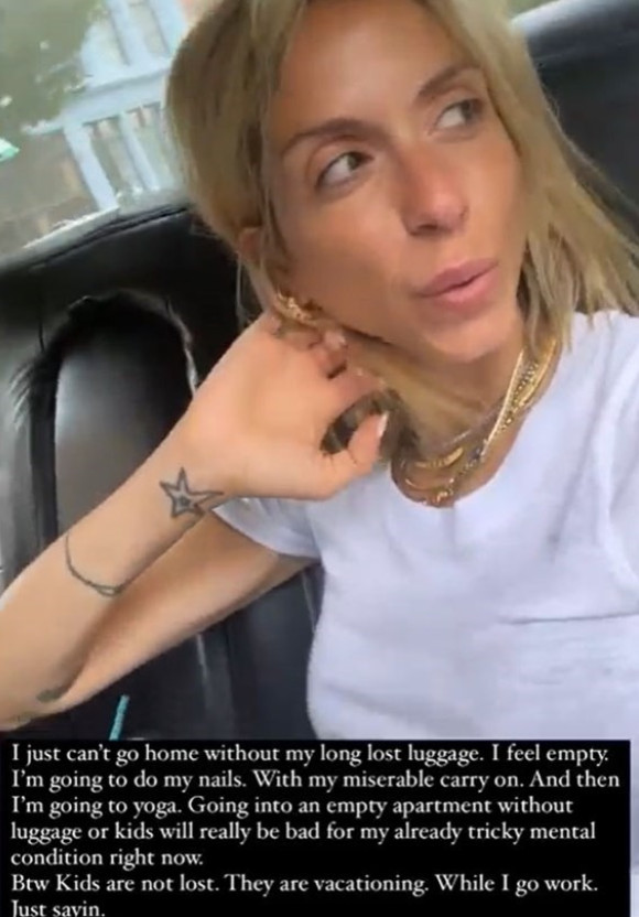 «Άλλο ένα θύμα χαμένων αποσκευών. Πάρα πολύ νευριασμένη. Είμαι υλίστρια οπότε αυτό είναι τρομερό για εμένα. Δεν μπορώ να πάω σπίτι με χωρίς τις χαμένες μου αποσκευές. Νιώθω άδεια. Θα πάω να φτιάξω τα νύχια μου. Και μετά θα πάω για γιόγκα.