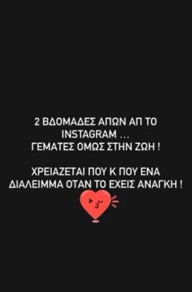 Στη συνέχεια έστειλε το δικό της μήνυμα: «2 εβδομάδες απών από το Instagram, γεμάτες όμως στη ζωή. Χρειάζεται που και που ένα διάλειμμα όταν το έχεις ανάγκη».