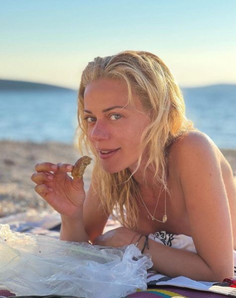 «Παξιμάδι, γραβιέρα, ντοματίνια, ελιές, λαδάκι, αλατάκι και ρίγανη! Αυτό είναι το μενού, μαζί με διάφορα άλλα. Όσοι αγαπάμε τις ερημικές παραλίες, κουβαλάμε πολλά… Καλοκαίρι και φαγητό!», έγραψε στην λεζάντα της φωτογραφίας που ανέβασε.