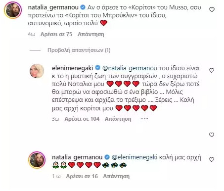 «Αν σου άρεσε το “Κορίτσι του Μusso” σου προτείνω το “Κορίτσι του Μπρούκλιν” του ίδιου, αστυνομικό, ωραίο πολύ» έγραψε η Ναταλία Γερμανού με την Ελένη Μενεγάκη να της απαντά. «Του ίδιου είναι και το “Μυστική ζωή των συγγραφέων” σ΄ ευχαριστώ πολύ Ναταλία μου. Τώρα δε ξέρω πότε θα μπορέσω να αφοσιωθώ σε ένα βιβλίο… Μόλις επέστρεψα και αρχίζει το τρέξιμο… Ξέρεις… Καλή μας αρχή κορίτσι μου».