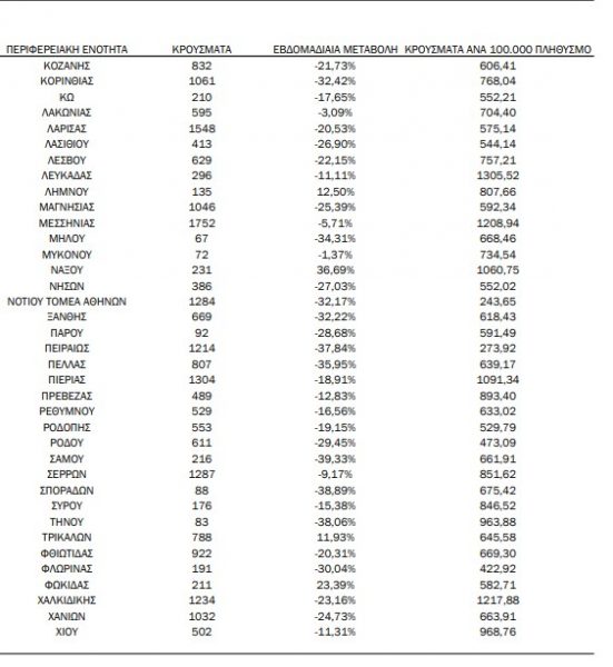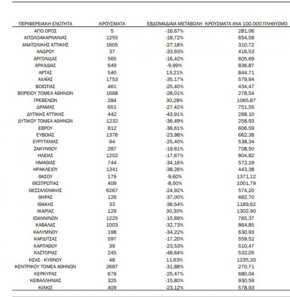 *Σύνολο των κρουσμάτων, η επίπτωση ανά 100.000 πληθυσμού καθώς και η εβδομαδιαία μεταβολή των επιβεβαιωμένων κρουσμάτων COVID-19 ανά περιφερειακή ενότητα την εβδομάδα αναφοράς σε σύγκριση με την προηγούμενη εβδομάδα.