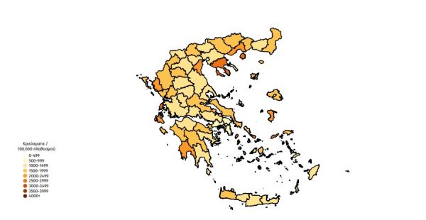 Ο χάρτης αποτυπώνει τη γεωγραφική κατανομή των κρουσμάτων COVID-19 των τελευταίων 14 ημερών ανά Περιφερειακή Ενότητα της χώρας, με βάση την δηλωθείσα διεύθυνση μόνιμης κατοικίας του ασθενούς, ή τη διεύθυνση προσωρινής διαμονής για τους τουρίστες και άλλους προσωρινά διαμένοντες στην Ελλάδα. Συμπεριλαμβάνονται τόσο κρούσματα με ιστορικό ταξιδίου (“εισαγόμενα”) όσο και κρούσματα με πιθανή εγχώρια μετάδοση.