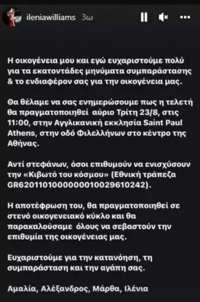 «Η οικογένειά μου και εγώ ευχαριστούμε πολύ για τα εκατοντάδες μηνύματα συμπαράστασης και το ενδιαφέρον σας για την οικογένειά μας. Θα θέλαμε να σας ενημερώσουμε πως η τελετή θα πραγματοποιηθεί αύριο, Τρίτη 23/8, στις 11:00, στην Αγγλικανική εκκλησία Saint Paul Athens στην οδό Φιλελλήνων στο κέντρο της Αθήνας. Αντί στεφάνων, όσοι επιθυμούν να ενισχύσουν την “Κιβωτό του Κόσμου”.