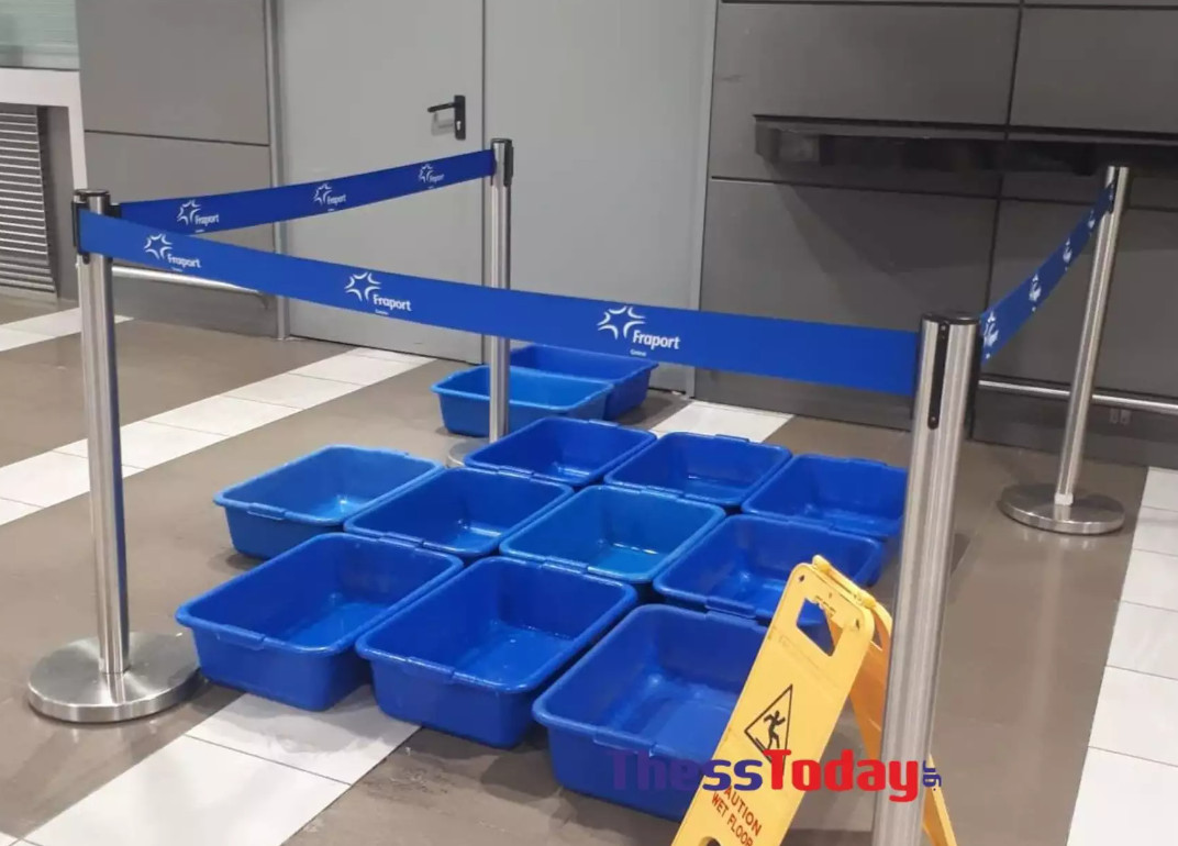 Όσοι επιβάτες κατευθύνονταν το μεσημέρι της Τρίτης προς τις πύλες του αεροδρομίου «Μακεδονία» αντίκρισαν τους εργαζομένους να επιχειρούν για αρκετή ώρα να μαζέψουν τα νερά που έσταζαν από την οροφή και να περιορίσουν την ποσότητα του νερού με έναν κουβά και σφουγγαρίστρες.