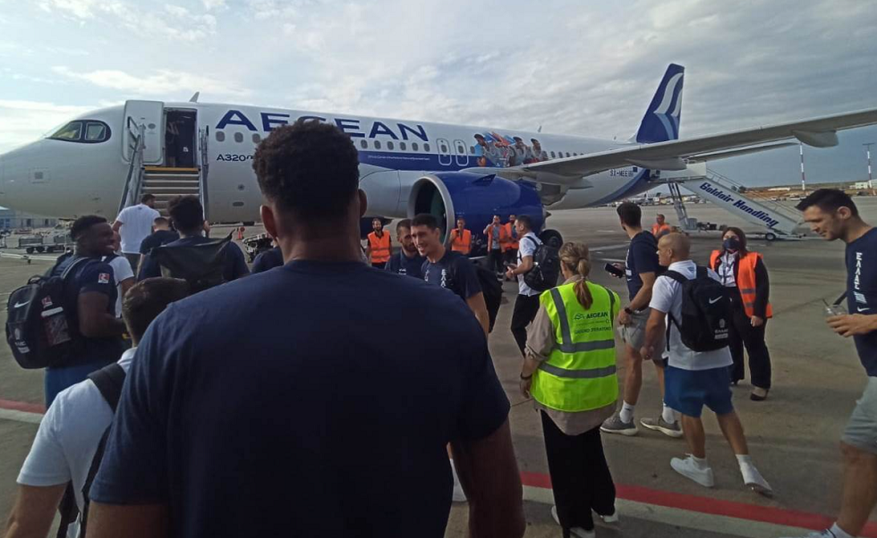 Η ελληνική αποστολή «πέταξε» για τη σερβική πρωτεύουσα με το αεροπλάνο της Aegean που έχει τη φιγούρα του Γιάννη Αντετοκούνμπο και άλλων Ελλήνων διεθνών, όπως του Θανάση Αντετοκούνμπο, του Κώστα Σλούκα, του Νικ Καλάθη, του Κώστα Παπανικολάου και του Γιώργου Παπαγιάννη.