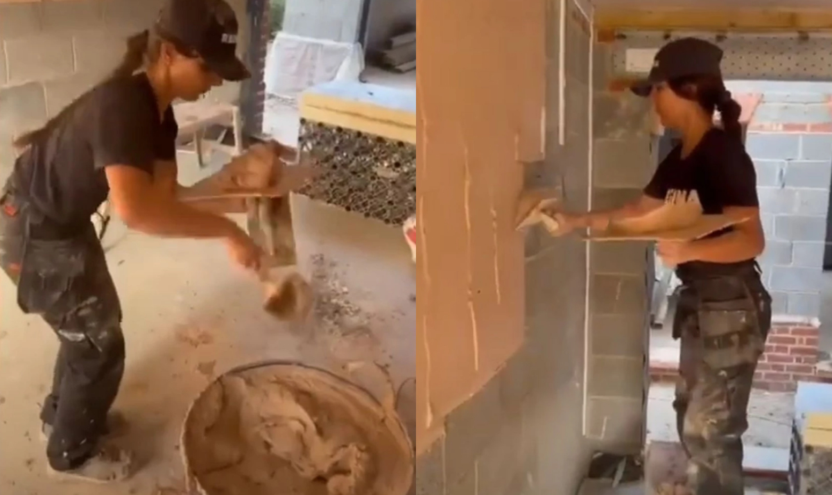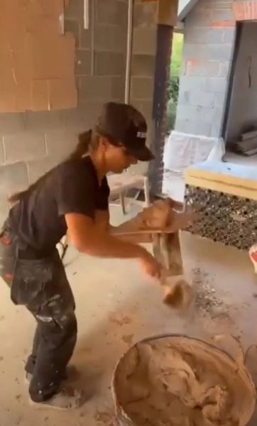 Η πρώτη δουλειά που έκανε ήταν να βάψει το υπόστεγο του σπιτιού της, μια δουλειά που δεν έχει μεν σχέση με το σοβάτισμα αλλά το έκανε απλά και μόνο για να αποδείξει πως είναι έτοιμη να ασχοληθεί με χειρονακτικές εργασίες και να γεμίσει λάσπες.