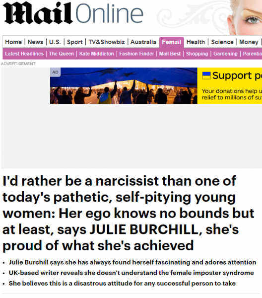 Ο λόγος για την Julie Burchill, η οποία γράφοντας στην διαδικτυακή έκδοση της Daily Mail, αναφέρει πως ανέκαθεν είχε ναρκισσιστική συμπεριφορά, όχι από κακία, αλλά γιατί πίστευε ότι μπορεί να πετύχει περισσότερα, σε σχέση με τα άτομα που είχε γύρω της.