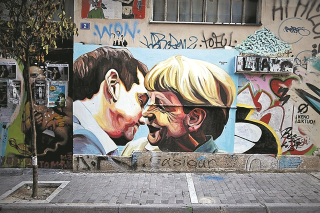 Αντίστοιχης έμπνευσης με το «φιλί» του Βρούμπελ είναι και το «φιλί της διχόνοιας», όπου ο τότε πρωθυπουργός Αλέξης Τσίπρας εμφανίζεται σε τρυφερό ενσταντανέ με τη γερμανίδα καγκελάριο Ανγκελα Μέρκελ.