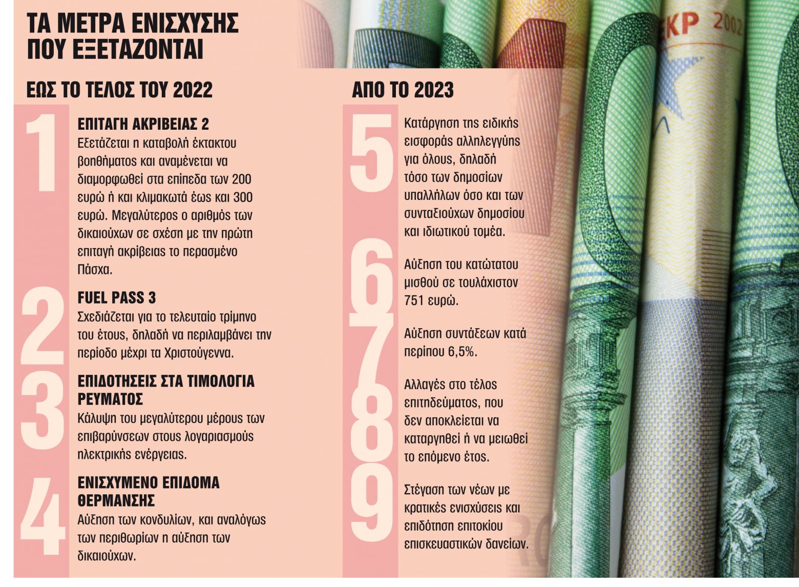 Μεταξύ των μέτρων που βρίσκονται υπό επεξεργασία είναι η καταβολή επιταγής ακρίβειας, το αυξημένο επίδομα θέρμανσης και επιδοτήσεις σε καύσιμα (fuel pass) και ρεύμα. Στο σκέλος των μόνιμων παρεμβάσεων είναι η επέκταση της κατάργησης της εισφοράς αλληλεγγύης στο Δημόσιο και τις συντάξεις, η αύξηση στις συντάξεις σε όσους συνταξιούχους δεν έχουν προσωπική διαφορά, τα αναδρομικά σε επικουρικές συντάξεις και δώρα που περικόπηκαν το 2012. Αναλόγως των δημοσιονομικών περιθωρίων για το 2023, εξετάζεται η μείωση συντελεστή φορολογίας για τις επιχειρήσεις από το 22% στο 20%, αλλά και η μείωση ή ακόμα και η κατάργηση του τέλους επιτηδεύματος.