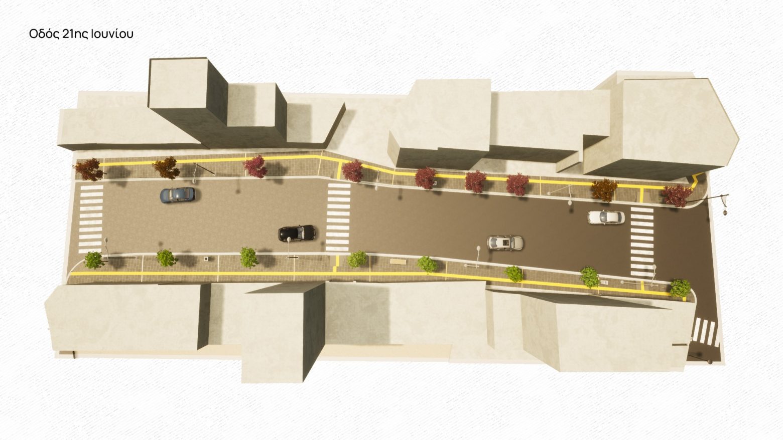 Στις οδούς 21η Ιουνίου, Βενιζέλου και Καπέτα σχεδιάζονται πλακοστρώσεις πεζοδρομίων με πλάκες και λωρίδες γρανίτη, φυτεύσεις καλλωπιστικών θάμνων, τοποθέτηση ραμπών ΑμεΑ, οδεύσεων τυφλών και διαβάσεων πεζών, έξυπνες διαβάσεις καθώς και η εγκατάσταση αστικού εξοπλισμού (φωτιστικά σώματα, κολωνάκια, παγκάκια και κάδοι απορριμμάτων).