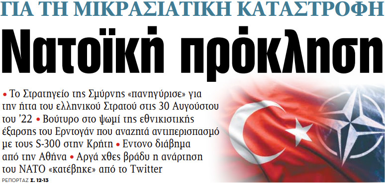• Το Στρατηγείο της Σμύρνης «πανηγύρισε» για την ήττα του ελληνικού Στρατού στις 30 Αυγούστου του ’22 • Βούτυρο στο ψωμί της εθνικιστικής έξαρσης του Ερντογάν που αναζητά αντιπερισπασμό με τους S-300 στην Κρήτη • Εντονο διάβημα από την Αθήνα • Αργά χθες βράδυ η ανάρτηση του ΝΑΤΟ «κατέβηκε» από το Τwitter