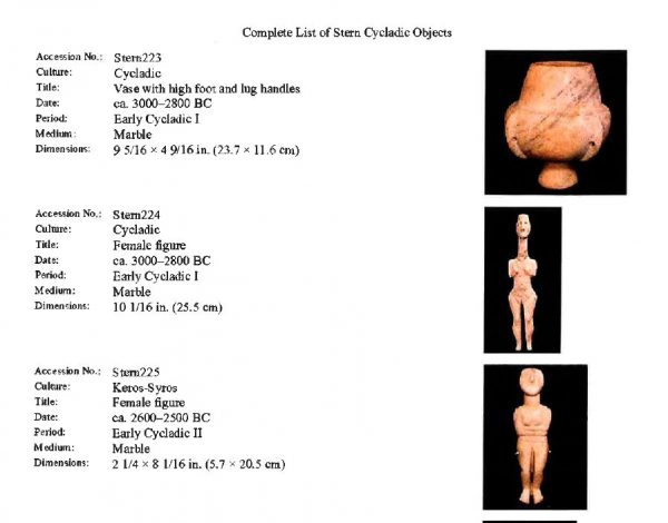 Στις επιστολές υπενθυμίζεται ότι τα ευρήματα του πρωτοκυκλαδικού πολιτισμού ανευρίσκονται μόνο σε θέσεις της Ελλάδας και όσα βρίσκονται ή και διακινούνται στο εξωτερικό αποτελούν προϊόντα παράνομης εξαγωγής από ελληνικό έδαφος, ως εκ τούτου το ελληνικό δημόσιο έχει κάθε νόμιμο και ηθικό λόγο να διεκδικήσει την κυριότητα και την κατοχή των 161 κυκλαδικών αρχαιοτήτων της Συλλογής Stern.