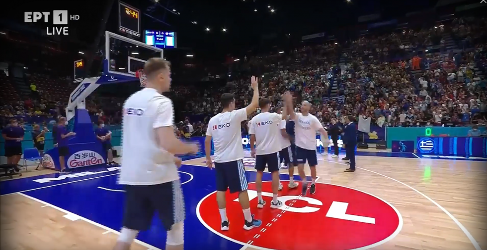 Με ελληνικές σημαίες και συνθήματα οι Έλληνες φίλαθλοι κάνουν αισθητή την παρουσία τους εντός και εκτός Mediolanum Forum, κάτι που φάνηκε και κατά την παρουσίαση του αντιπροσωπευτικού μας συγκροτήματος η οποία έγινε εν μέσω αποθέωσης.