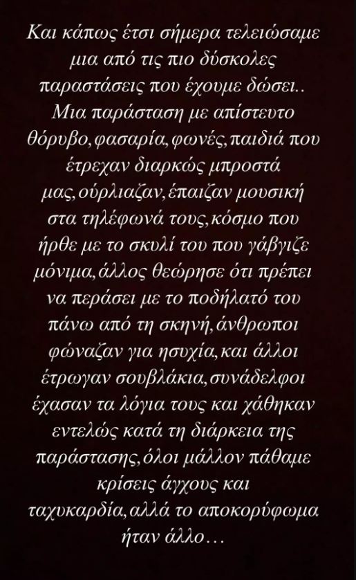 «Και κάπως έτσι σήμερα τελειώσαμε μια από τις πιο δύσκολες παραστάσεις που έχουμε δώσει… Μια παράσταση με απίστευτο θόρυβο, φασαρία, φωνές, παιδιά που έτρεχαν διαρκώς μπροστά μας, ούρλιαζαν, έπαιζαν μουσική στα τηλέφωνά τους, κόσμο που ήρθε με το σκυλί του που γάβγιζε μόνιμα, άλλος θεώρησε ότι πρέπει να περάσει με το ποδήλατό του πάνω από τη σκηνή, άνθρωποι φώναζαν για ησυχία και άλλοι έτρωγαν σουβλάκια, συνάδελφοι έχασαν τα λόγια τους και χάθηκαν εντελώς κατά τη διάρκεια της παράστασης, όλοι μάλλον πάθαμε κρίσεις άγχους και ταχυκαρδία, αλλά το αποκορύφωμα ήταν άλλο.
