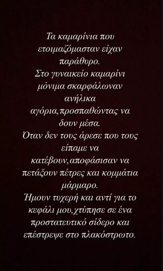 »Τα καμαρίνια που ετοιμαζόμασταν είχαν παράθυρο. Στο γυναικείο καμαρίνι μόνιμα σκαρφάλωναν ανήλικα αγόρια, προσπαθώντας να δουν μέσα. Όταν δεν τους άρεσε που τους είπαμε να κατέβουν, αποφάσισαν να πετάξουν πέτρες και κομμάτια μάρμαρο. Ήμουν τυχερή και αντί για το κεφάλι μου, χτύπησε σε ένα προστατευτικό σίδερο και επέστρεψε στο πλακόστρωτο» έγραψε η Ιωάννα Πηλιχού και συνέχισε: