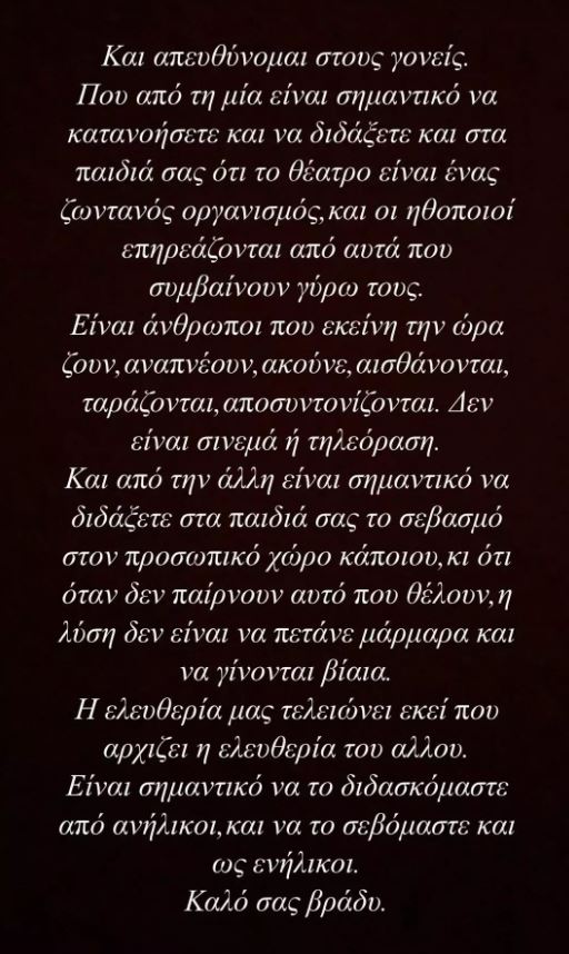 «Και απευθύνομαι στους γονείς που από τη μια είναι σημαντικό να κατανοήσετε και να διδάξετε και τα παιδιά σας ότι το θέατρο είναι ένας ζωντανός οργανισμός. και οι ηθοποιοί εργάζονται από αυτά που συμβαίνουν γύρω τους. Είναι άνθρωποι που εκείνη την ώρα ζουν, αναπνέουν, ακούν, αισθάνονται, ταράζονται, αποσυντονίζονται. Δεν είναι σινεμά ή τηλεόραση.
