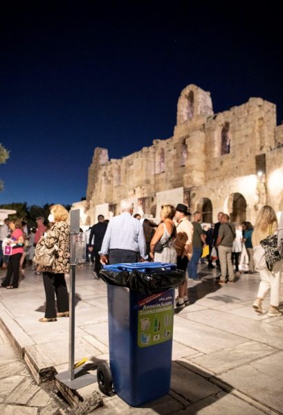 Έτσι και φέτος τοποθετήθηκαν σε εμφανή σημεία 15 μπλε κάδοι στο Ηρώδειο και 15 στην Πειραιώς 260, χωρητικότητας 120 λίτρων ο καθένας, δίνοντας τη δυνατότητα στους επισκέπτες να απορρίπτουν πλαστικά μπουκαλάκια και άλλες ανακυκλώσιμες συσκευασίες, ύστερα και από σχετική υπόδειξη των ταξιθετριών/τών.