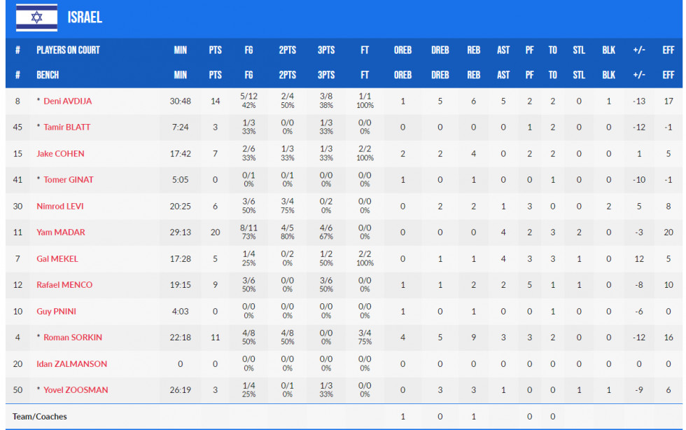 Mάλιστα το Ισραήλ πέρασε μπροστά στο σκορ με 30-28 χάρη στο τρίποντο του Μάνταρ, ωστόσο από εκείνο το σημείο και έπειτα δεν μπόρεσε ποτέ ξανά να φανεί ανταγωνιστικό.